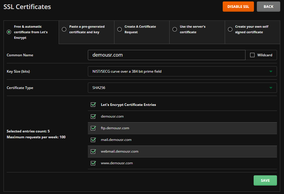 As below the Let's Encrypt Certificate Entries are already pre-selected. If you are using mail hosted externally to us then you may uncheck mail.{yourdomainname} and webmail.{yourdomainname}.Â